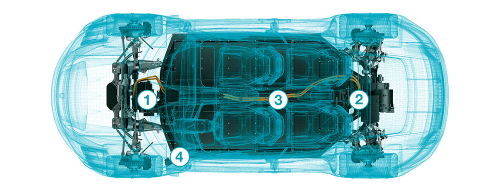 The concept study has two electric motors (1, 2). Its 800-volt powertrain enables short charging times and extended range. The lithium-ion battery (3) is integrated into the underbody, which improves weight distribution and also enables inductive charging. The conventional charging port is located in the front left fender (4).